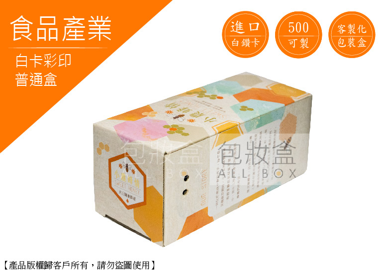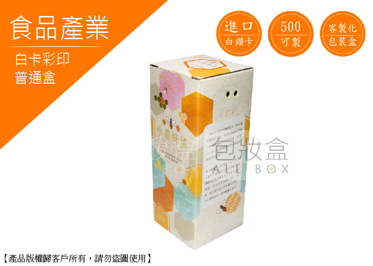 .顏色:彩色印刷+單面霧膜 .特點:數量500即可客製化/多種尺寸量身訂做/隨拿隨用 .用途:蜂蜜/包裝盒/食品禮盒/送禮/便利袋/一般包裝材/紙盒/造型盒子