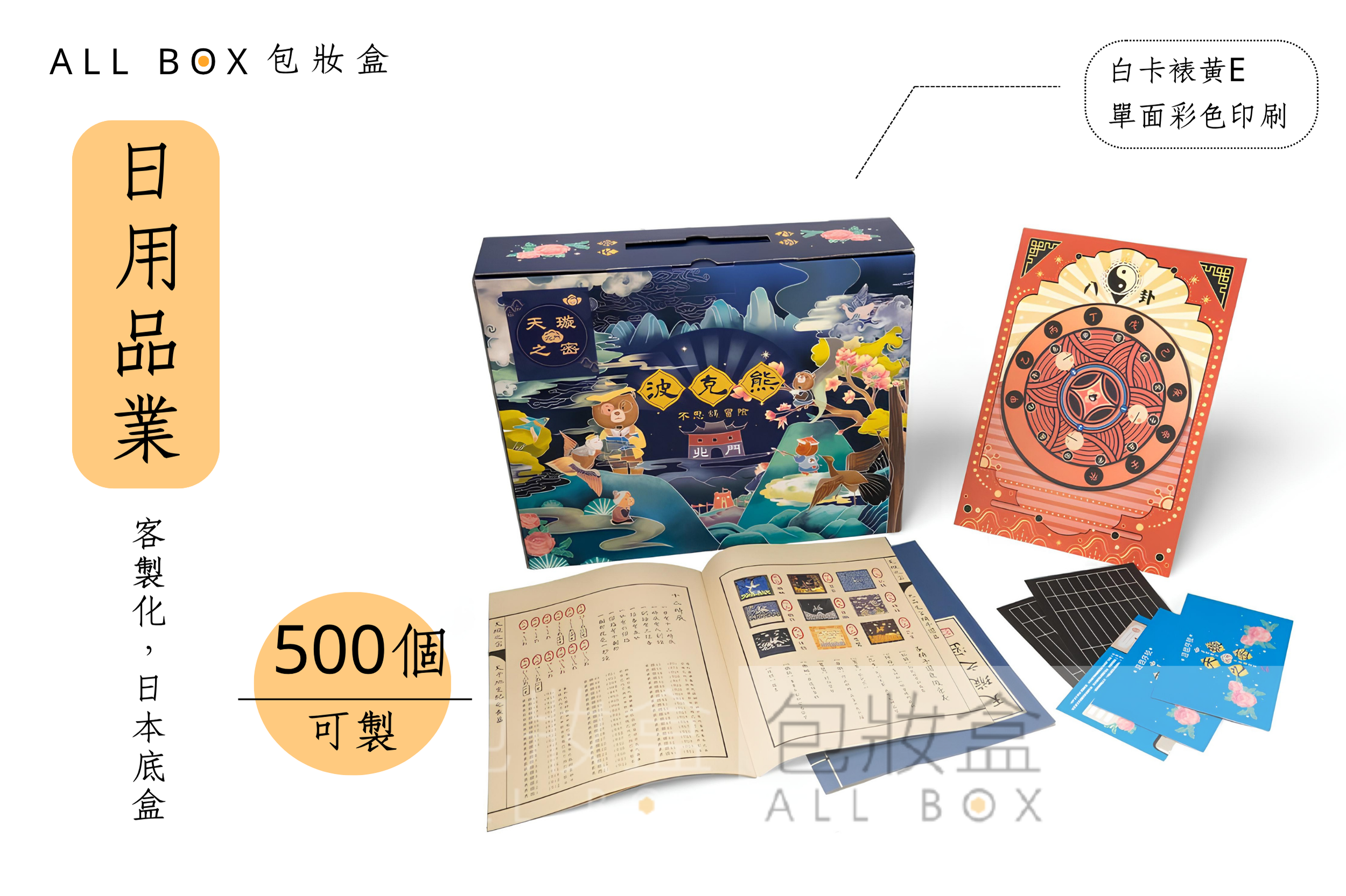 .顏色:白卡裱黃E浪+單面彩色印刷 .特點:數量500即可客製化/多種尺寸量身訂做/隨拿隨用/白卡彩色印刷 .用途:觀光文創/禮品/送禮/桌遊包裝/便利攜帶/一般包裝材/紙盒/普通盒/彩盒