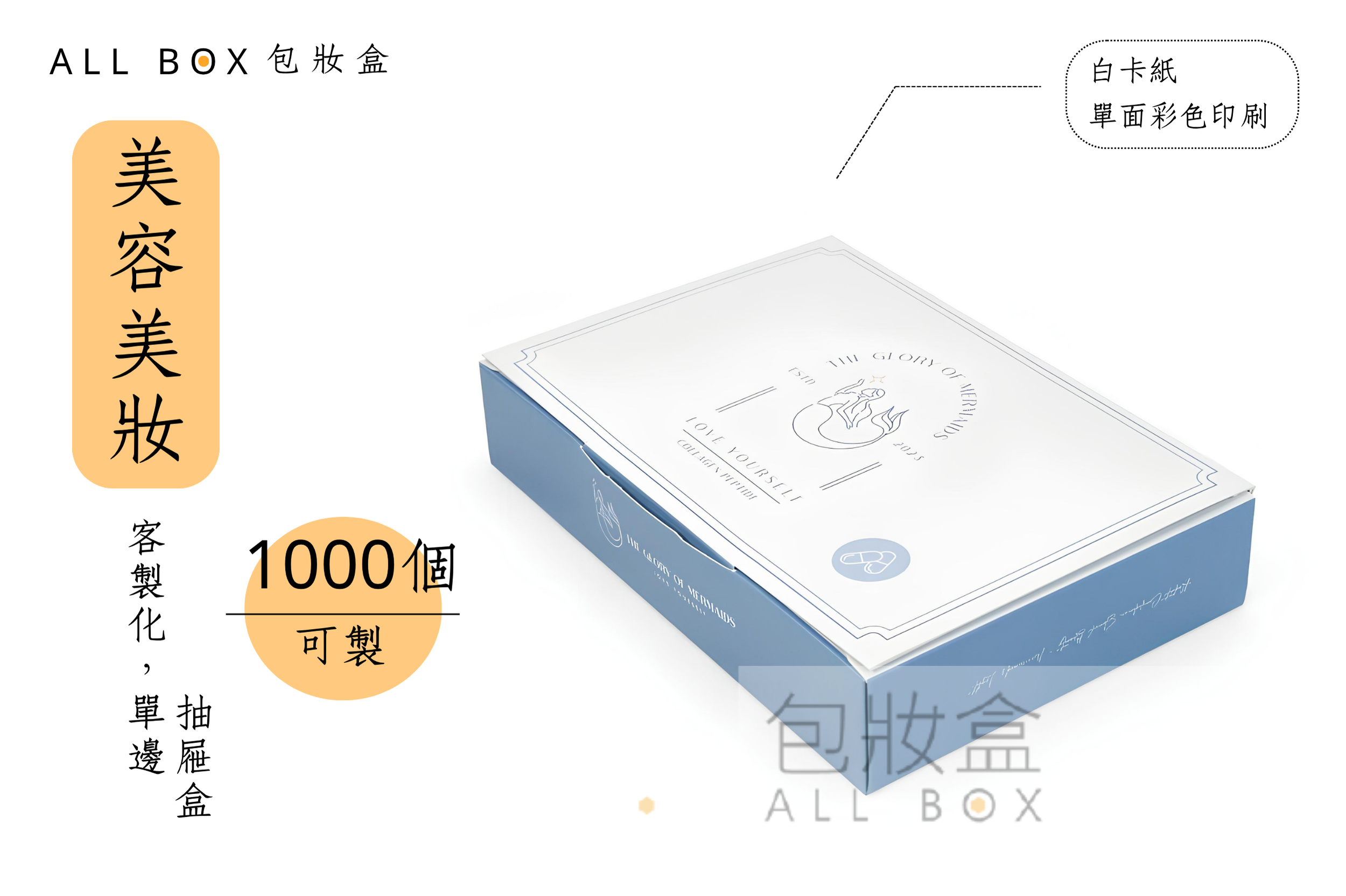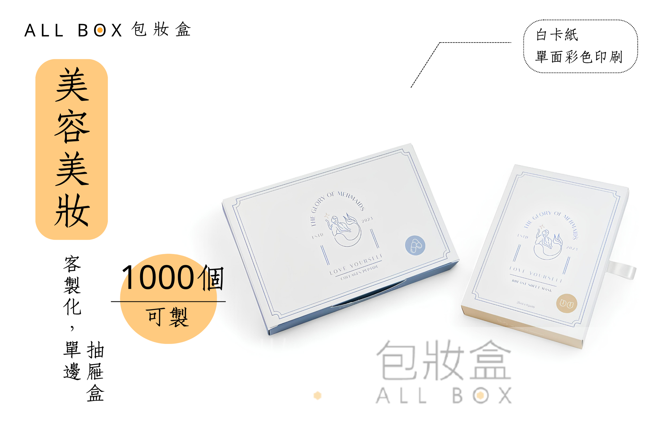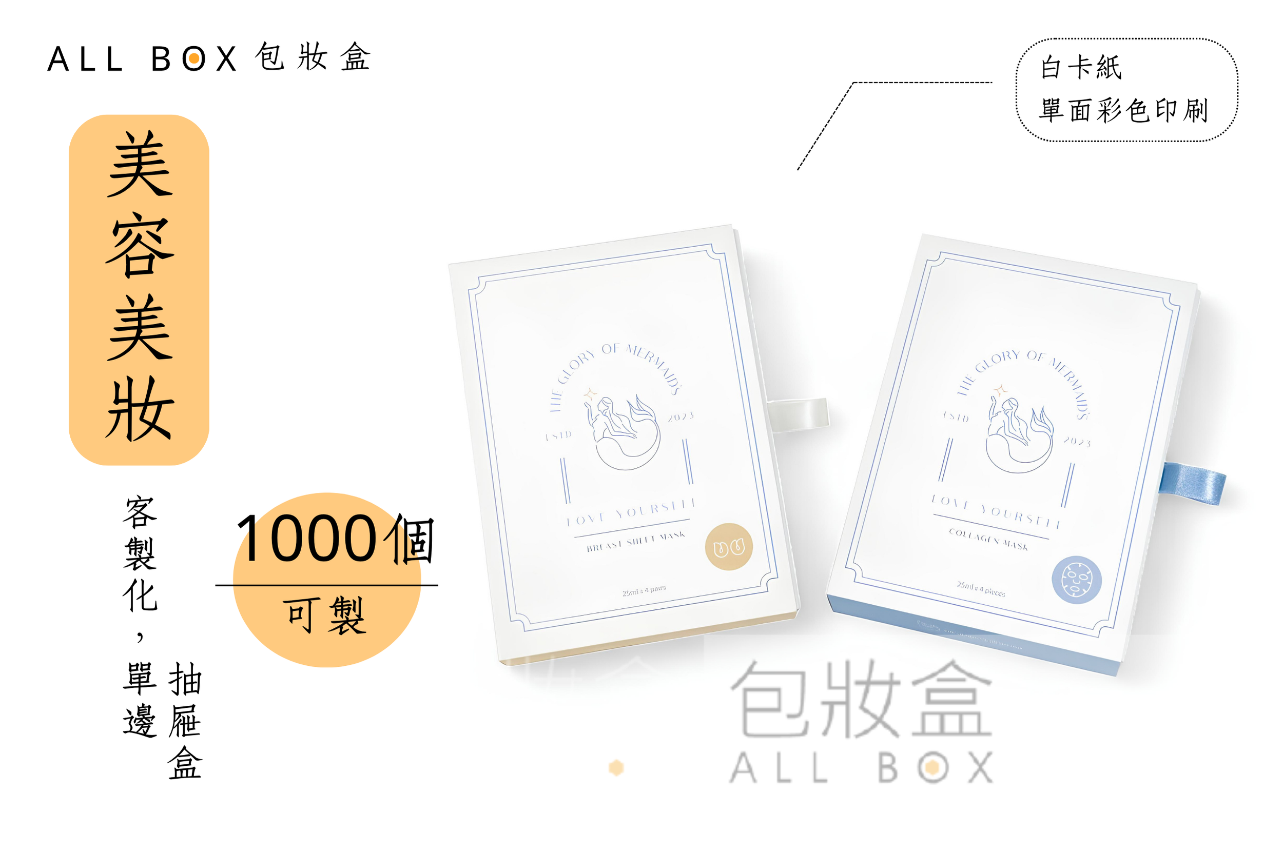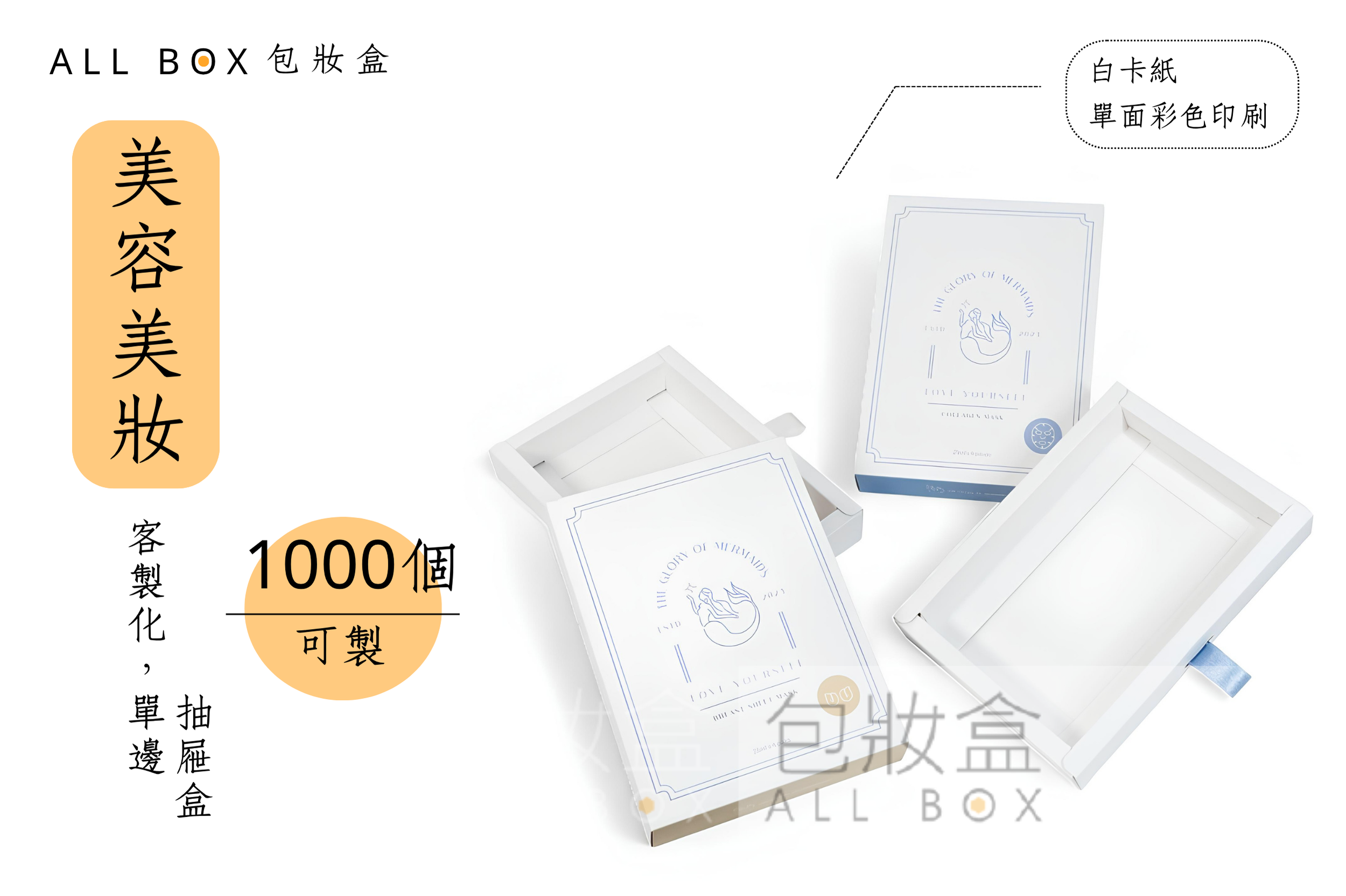 .顏色:白卡彩色印刷+單面霧膜 .特點:數量1000即可客製化/多種尺寸量身訂做/隨拿隨用 .用途:面膜抽屜盒/精品包裝/防摔外盒/彩妝外盒/展示/送禮/便利攜帶/運輸/一般包裝材/紙盒/彩盒