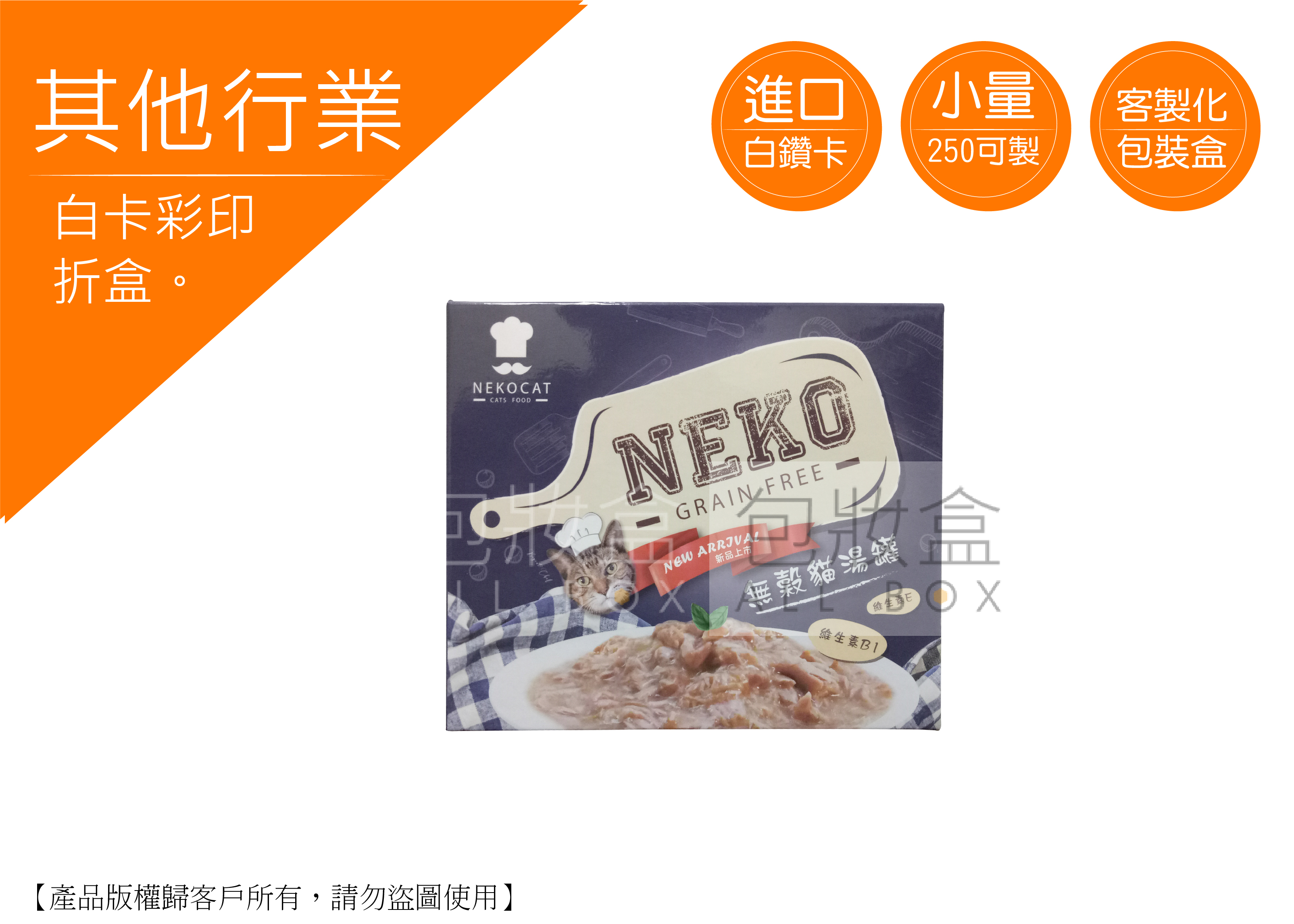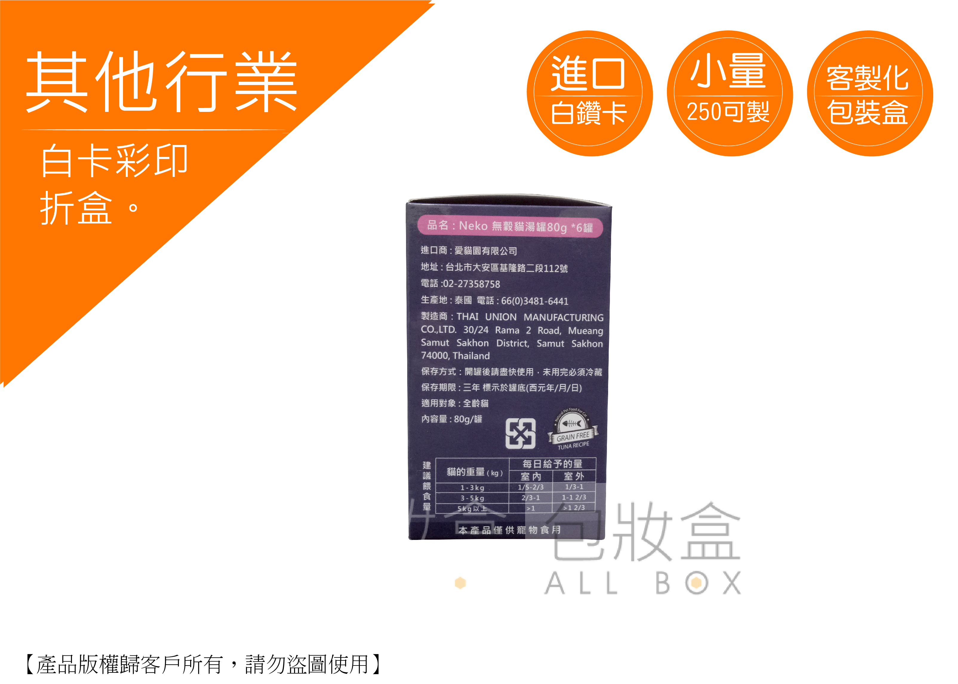 .顏色:彩色印刷 .特點:數量250即可客製化/多種尺寸量身訂做/隨拿隨用 .用途:飼料盒/禮盒/送禮/寵物愛用訂製彩盒/便利袋/運輸/一般包裝材/紙盒