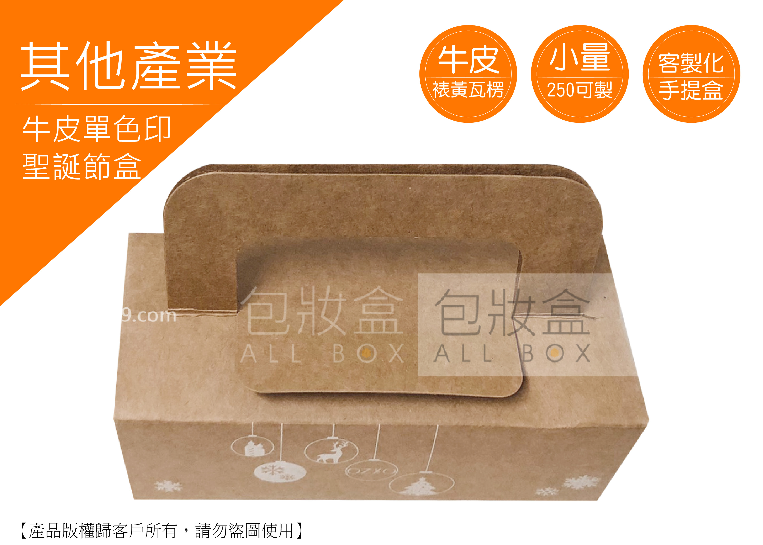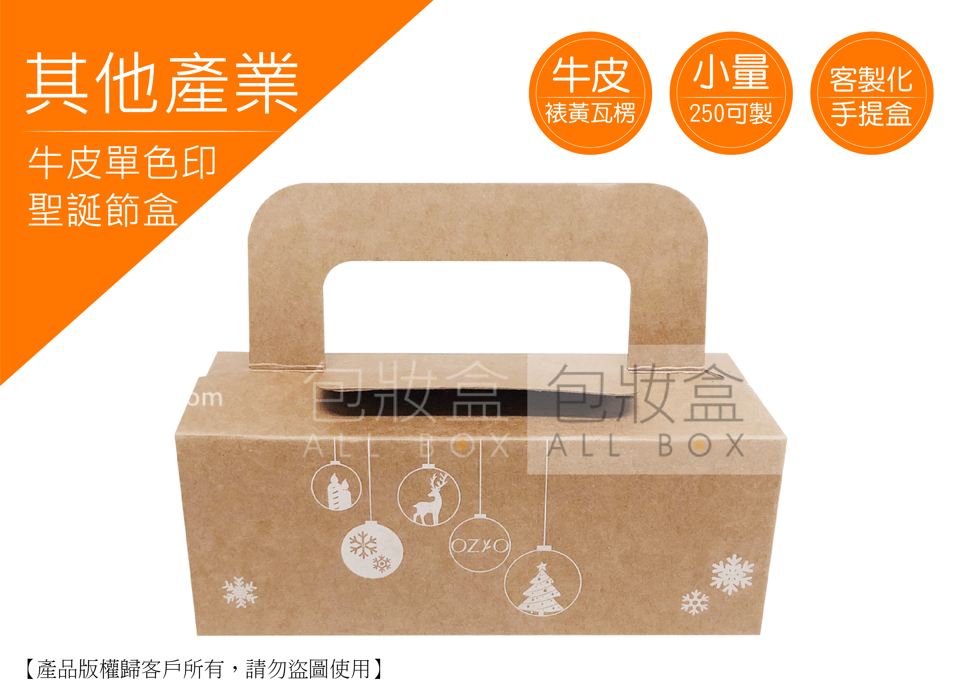 .顏色:彩色印刷 .特點:數量250即可客製化/多種尺寸量身訂做/隨拿隨用 .用途:節日禮盒/聖誕節/禮盒/送禮/方便攜帶/便利袋/運輸/一般包裝材/紙盒