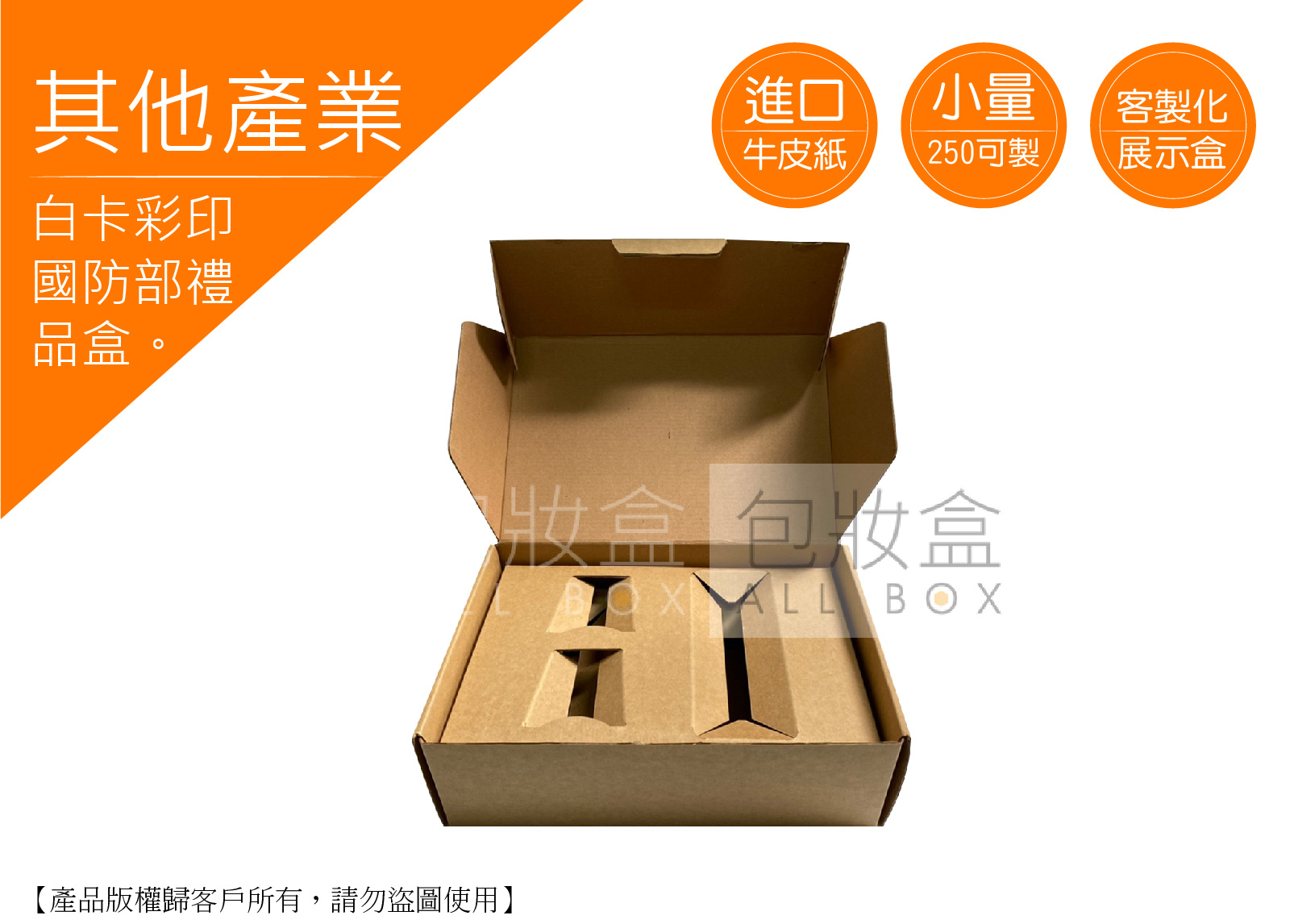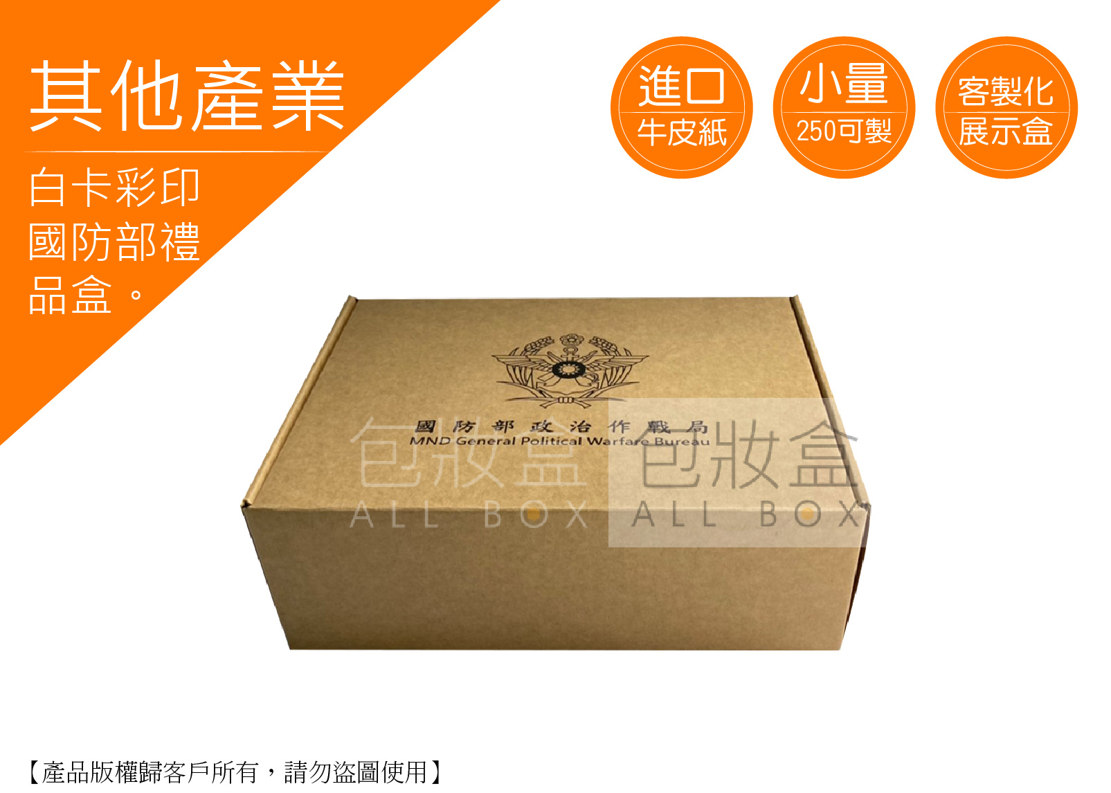 .顏色:無色印刷,燙金(咖啡) .特點:數量250即可客製化/多種尺寸量身訂做/隨拿隨用 .用途:送禮適用包裝/國防專用紙盒/產品包裝/攜帶方便/販售/運輸/紙盒/彩盒/厚紙彩盒